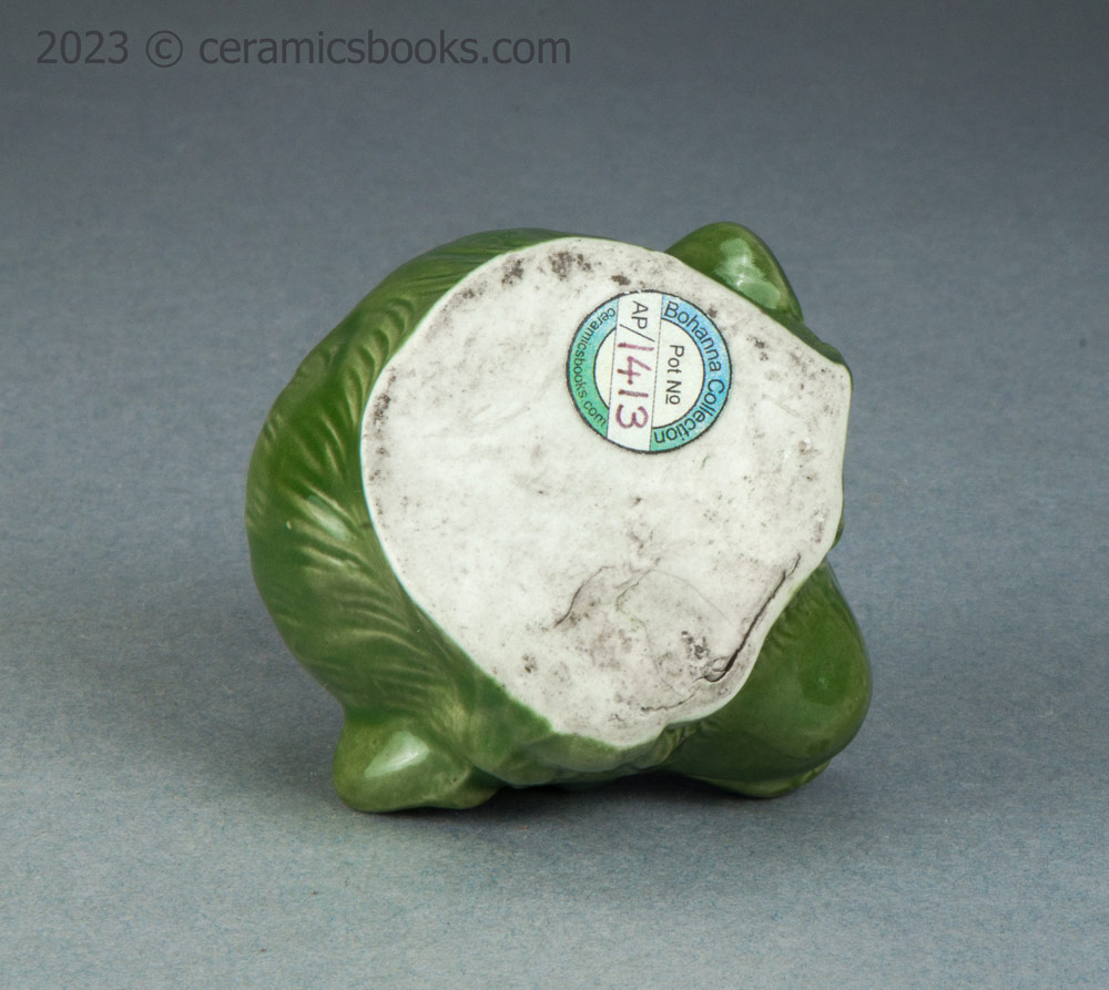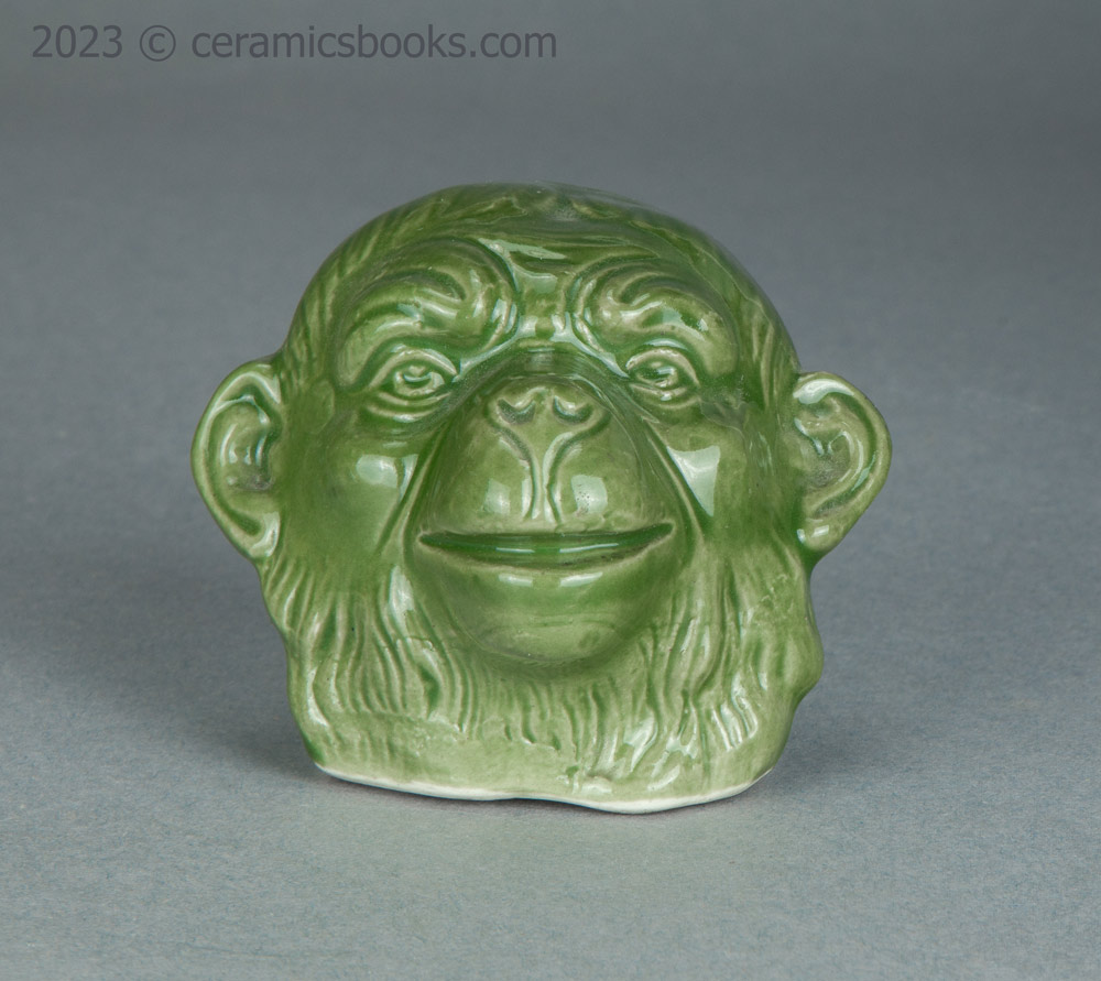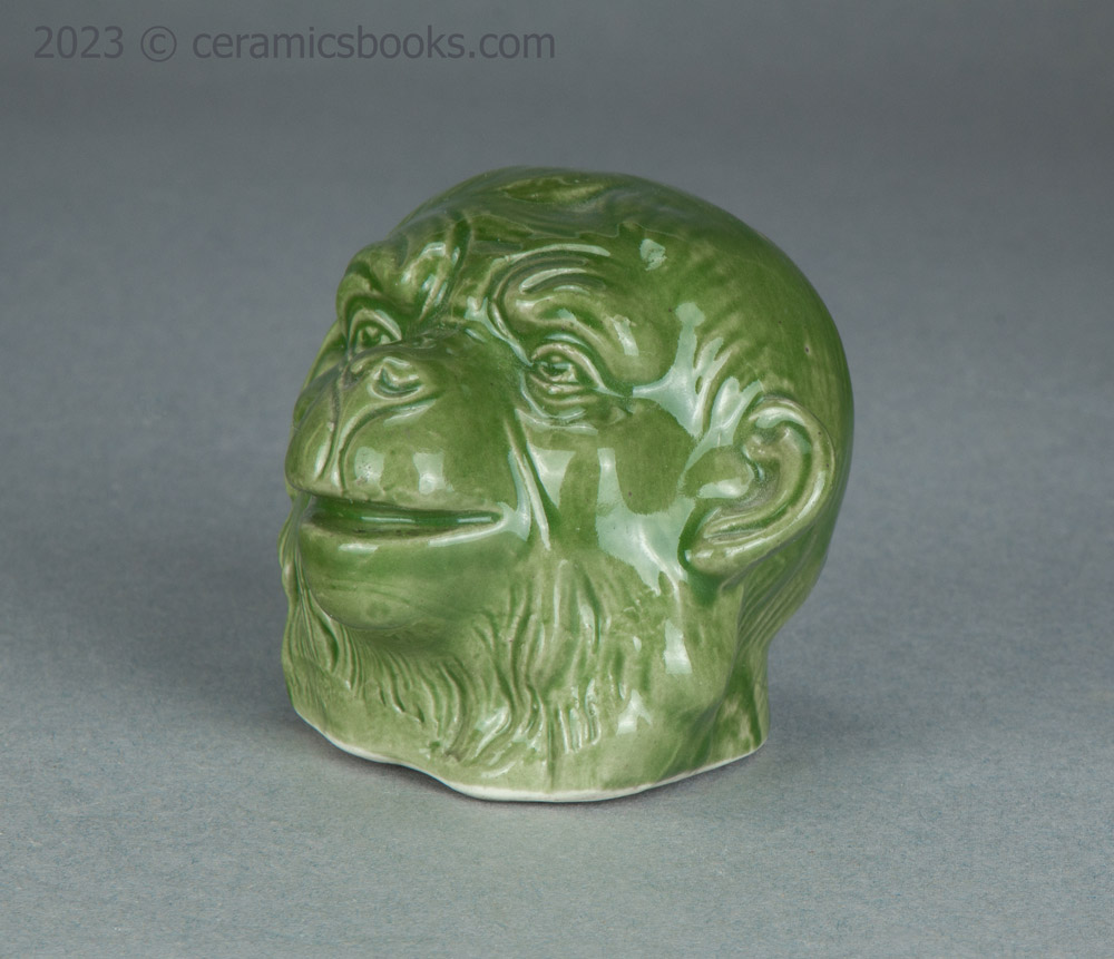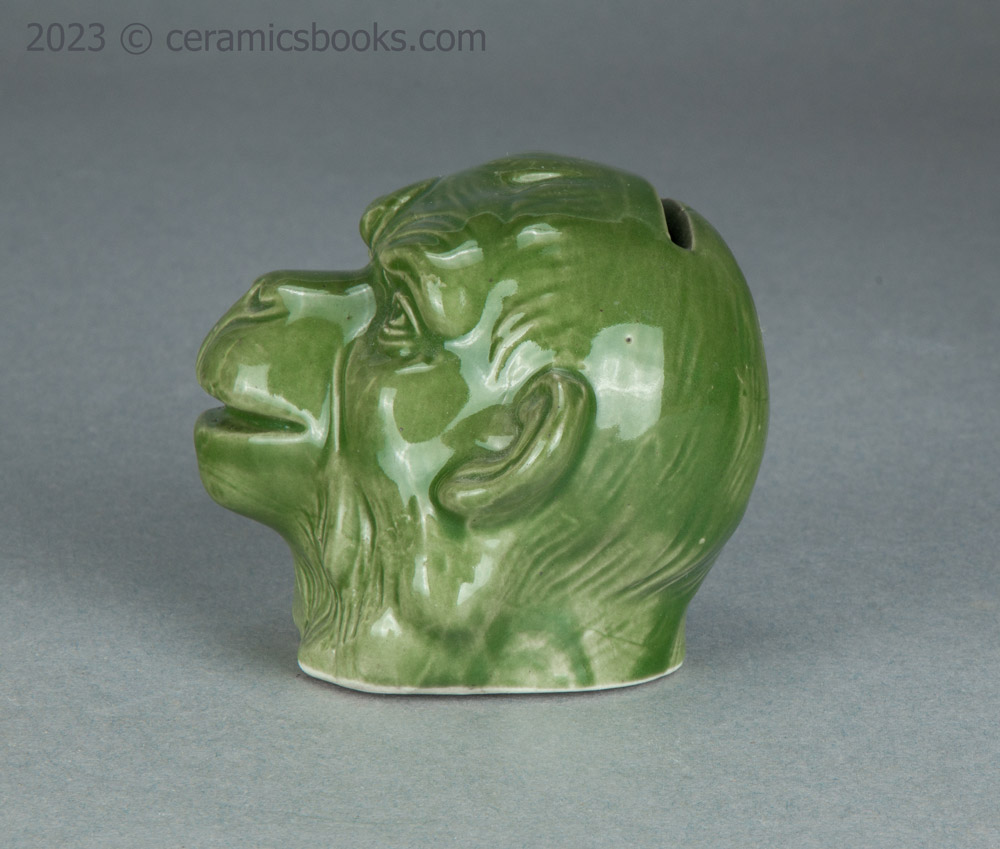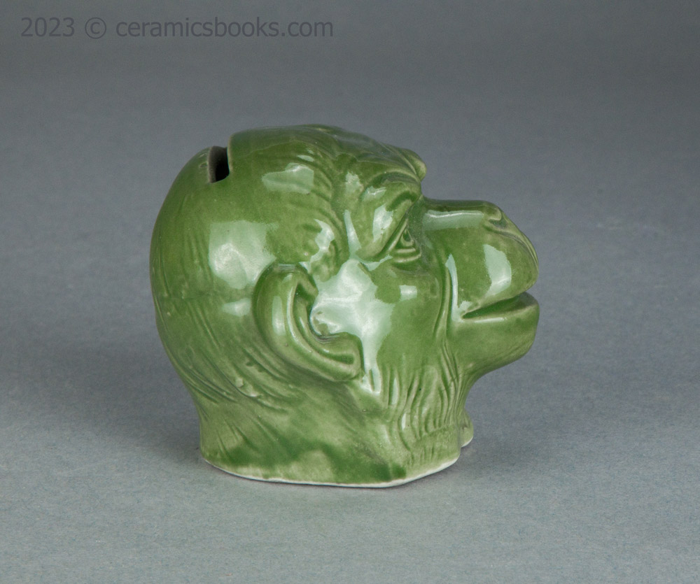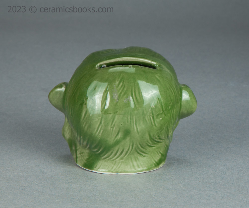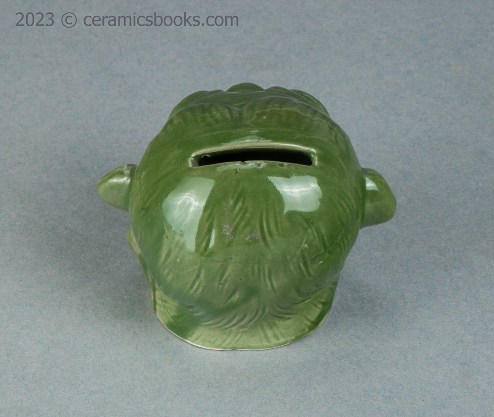 A slip cast porcelainous china moneybox (coin bank) in the form of a monkey’s head with an open mouth. The glaze is a fairly opaque chrome oxide green, which covers everything except the flat base. The coin slot is cut across the top of the head. No markings.